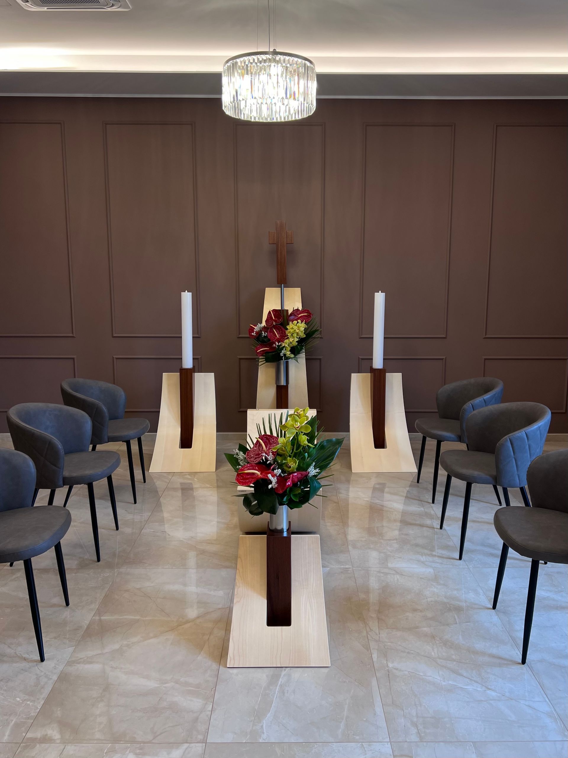 Gli ambienti comprendono sale riservate e separate, uffici dedicati, area ristoro, sala preparazione e un giardino esterno pensato come luogo di raccoglimento. Ogni sala è caratterizzata da un’identità simbolica che richiama valori di forza, continuità e rinnovamento.